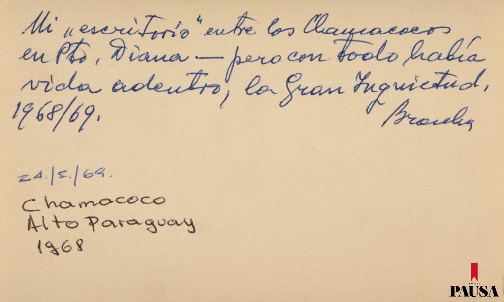 “Mi escritorio entre los chamacocos en Puerto Diana. Pero con todo, había vida adentro. La gran inquietud”, escribió al dorso de una de las postales conservadas en el Museo Etnográfico Andrés Barbero. La imagen data del año 1968, en Alto Paraguay, y pertenece a una de sus tantas expediciones de campo. Se puede ver una pequeña y sencilla pieza de madera. Para Branka –como la llamaban sus allegados–, cualquier lugar era ideal para desarrollar su trabajo.