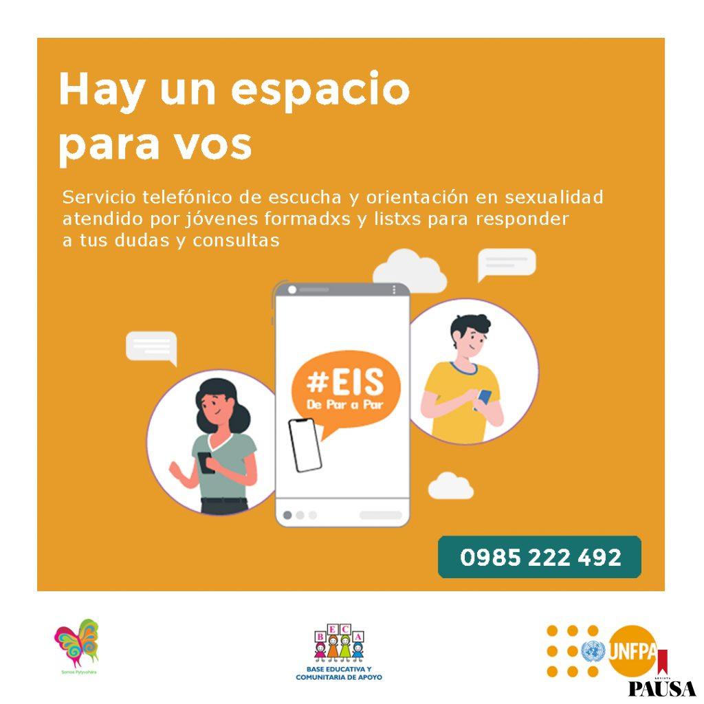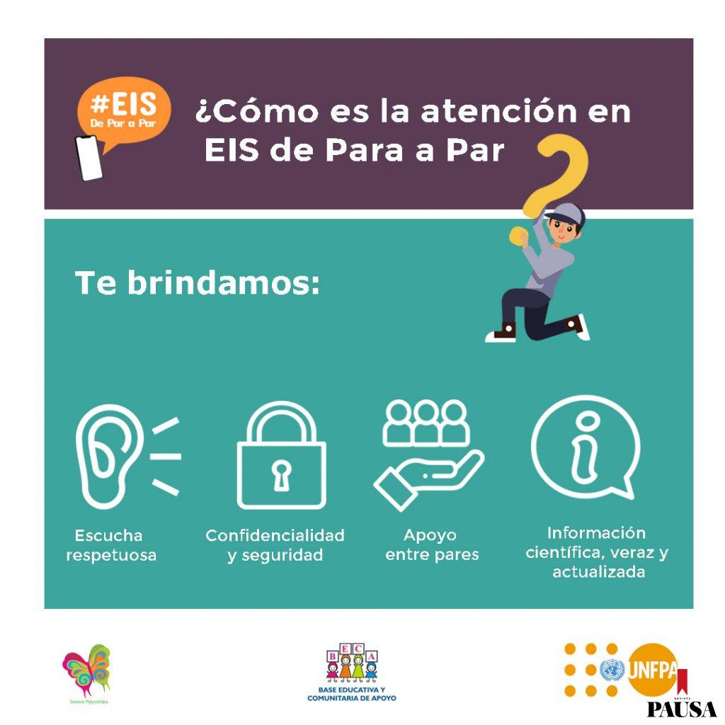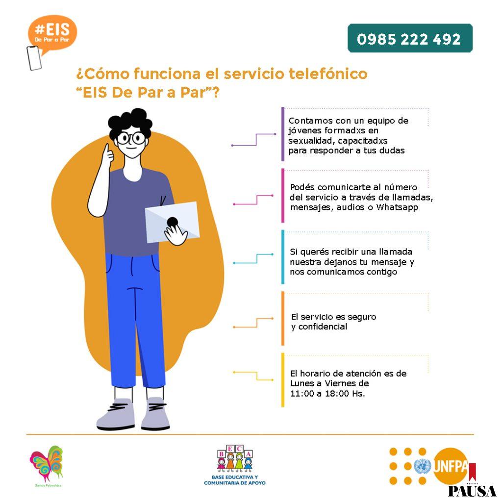 El nombre de la línea telefónica responde a las siglas Educación Integral de la Sexualidad (EIS) y de Par a Par se refiere a que el contacto se da de joven a joven, reivindicando también esa conversación entre amigos, amena, por medio del respeto, valorando las experiencias para seguir construyendo y aprendiendo. Las y los adolescentes pueden enviar un mensaje, escribir al WhatsApp o pedir que se les llame, en caso de que no cuenten con saldo, así las consejeras se comunicarán con ellos. El servicio está disponible de lunes a viernes, de 11.00 a 18.00, al (0985) 222-492.