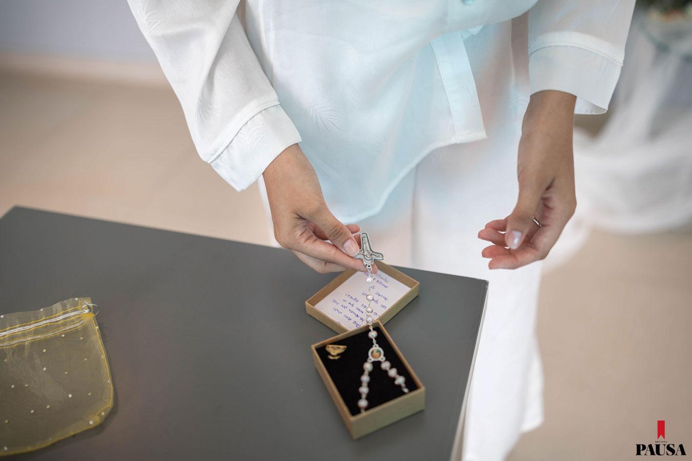 Alba encuentra mucho significado en los rituales, y su boda no podía estar exenta de algunas tradiciones. Cuando se vestía para llegar puntualmente a las 16.00 a la ceremonia, hubo un momento que la conmovió: “Entre tantas cosas de la boda, me había olvidado un detalle: ese día, mis amigas me enviaron regalos. Una de ellas me entregó una caja con un rosario y, realmente, fue algo mágico y emocionante. Primero, por saber que ellas estaban muy presentes, y segundo, que pensaran en cada detalle”.