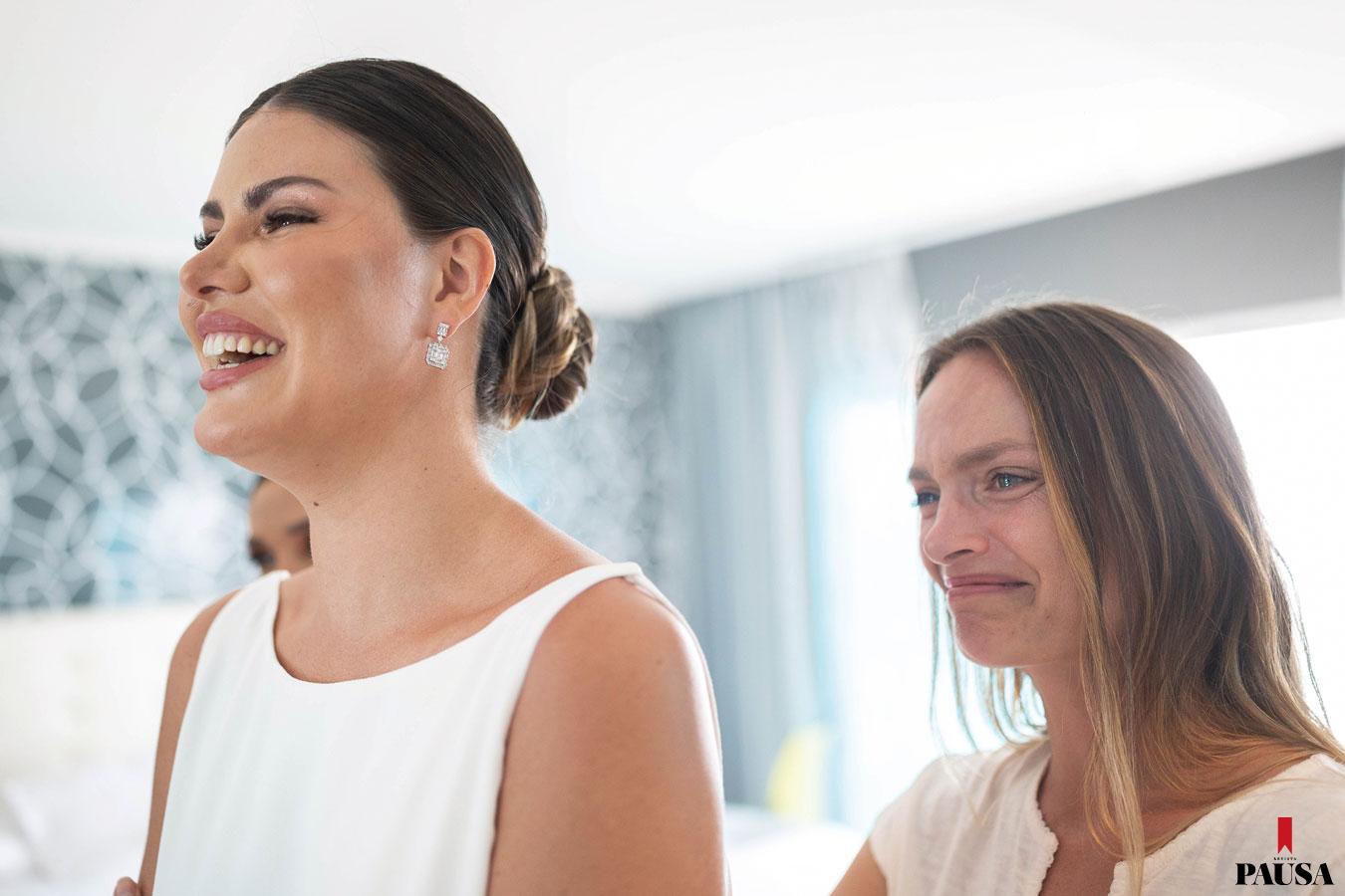 “Previamente me maquillé con mis amigas y cuñadas. La playa estaba hermosa ese día”, recuerda la novia. Alba recuerda una conexión definitiva con su vestido: “Elegimos la experiencia de SAX, a donde fui con mis amigas y mi mamá. Realmente lo elegí, me lo puse y cuando salí a mostrarles, todas nos emocionamos mucho. Es clásico y elegante, un estilo que me define”. Escogió uno de la marca española Pronovias.