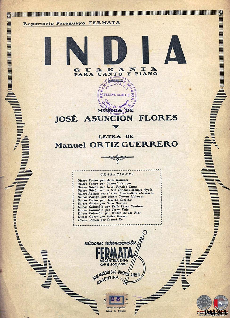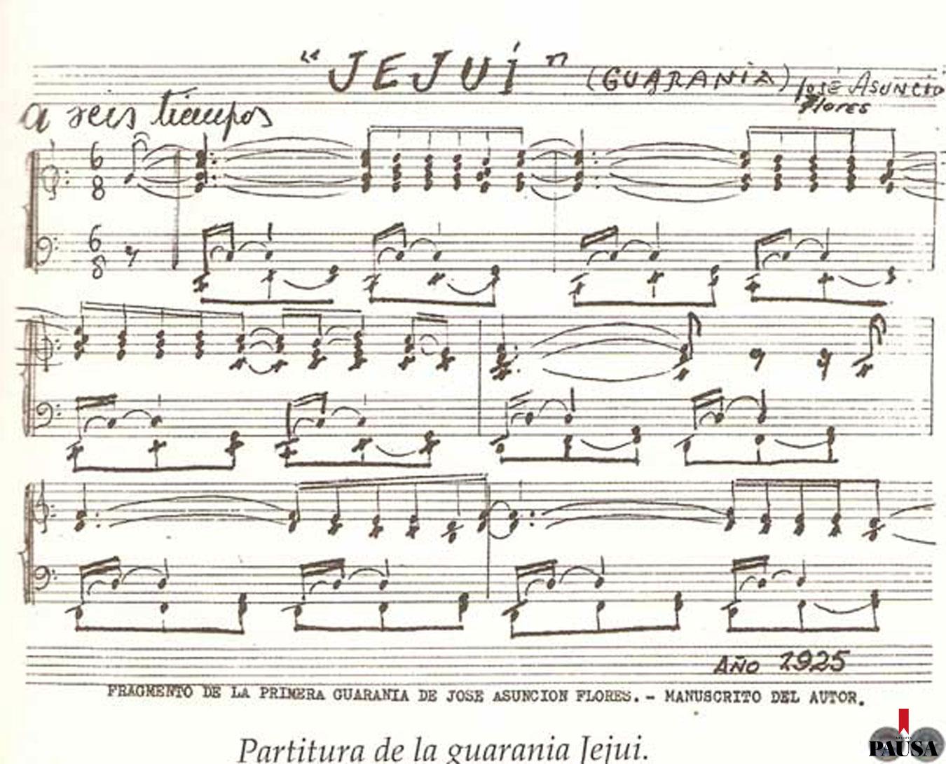 La primera guarania fue Jejuí, creada en 1925 por José Asunción Flores. De esta solo se conocen seis compases, ya que el resto de la partitura permanece, hasta ahora, desaparecida. Él compuso esta pieza como una celebración de la belleza de la tierra natal, pero también como una manifestación de su compromiso con el arte como un vehículo para preservar la identidad y el espíritu de su pueblo.