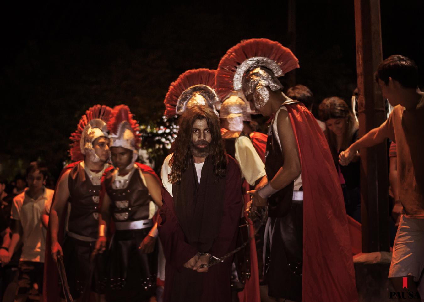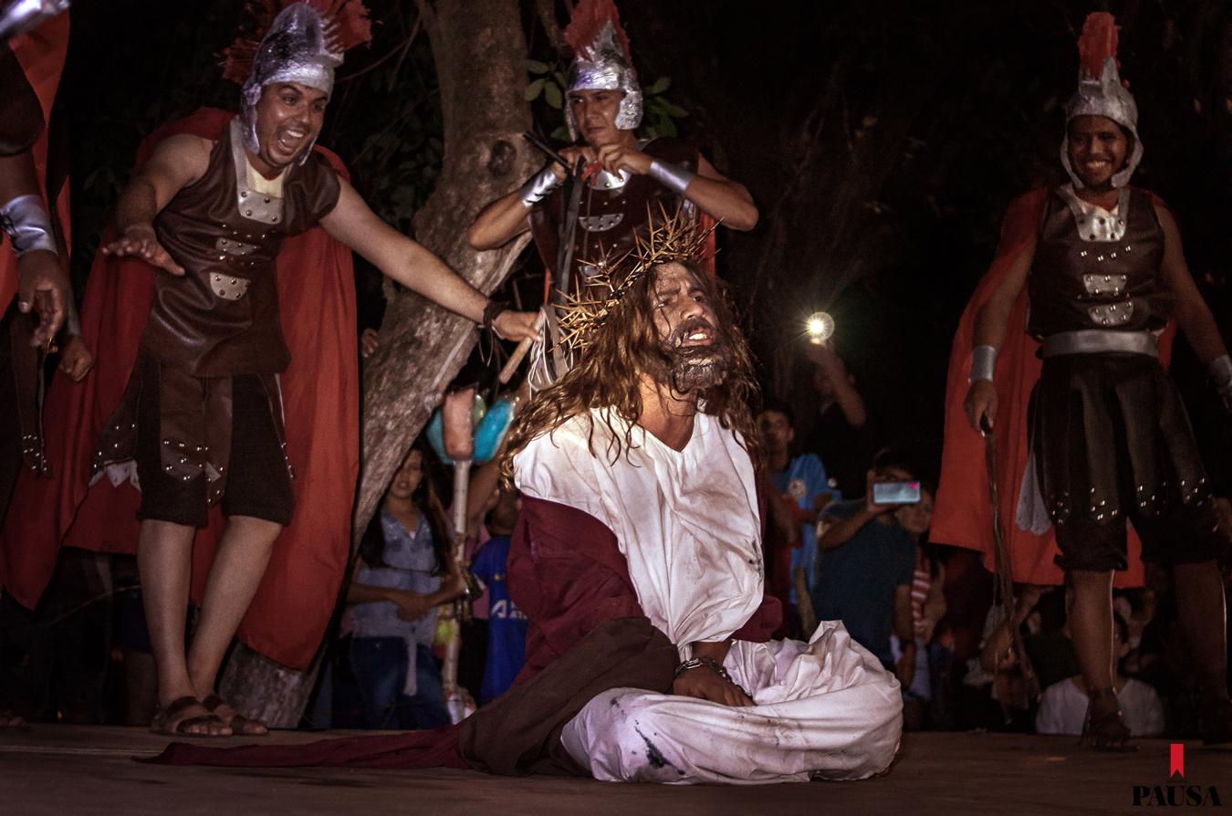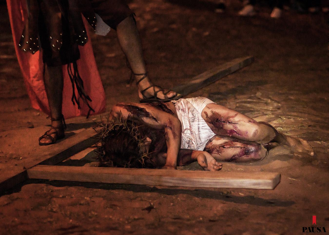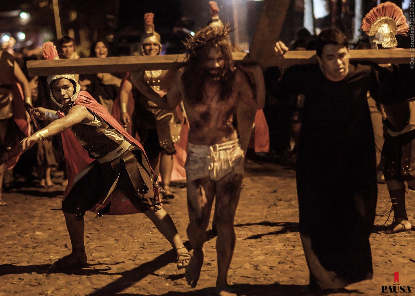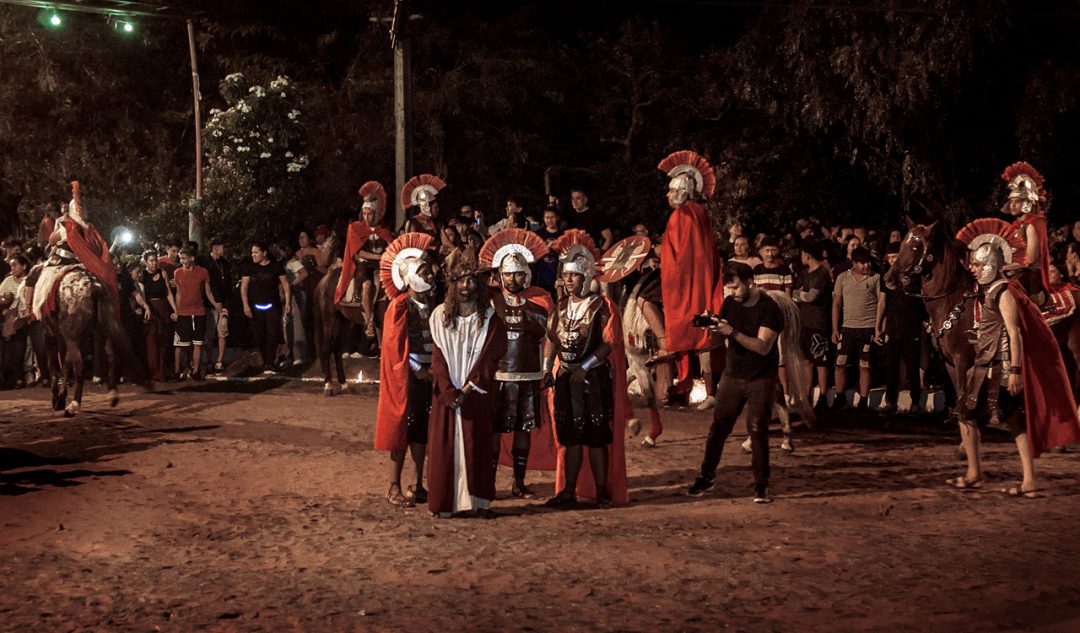 No es la primera vez que teatralizan el vía crucis en Yaguarón. Luis Recalde, productor del elenco, recuerda los antecedentes: Un hombre llamado Jesús, adaptada por Julián Bordón, y El camino de la cruz, que se hacía en el patio del templo. Pero al nacer Teatro Yara en 2018, algo cambió y pusieron manos a la obra (literalmente). Héctor Lozzca, entonces director, introdujo elementos que definieron una identidad: la tropa montada, el protagonismo del fuego, énfasis en el vestuario y maquillaje. Y, sobre todo, el guaraní.