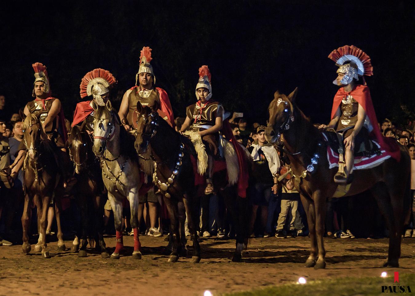 Hay en esos minutos previos una solemnidad que no necesita discursos. El silencio se vuelve denso. Los actores, 40 en total, ajustan sus túnicas. Los soldados romanos, miembros de la Caballería de Yaguarón, revisan el paso de sus caballos. Las antorchas —200, también artesanales, hechas por los mismos intérpretes— esperan su turno.