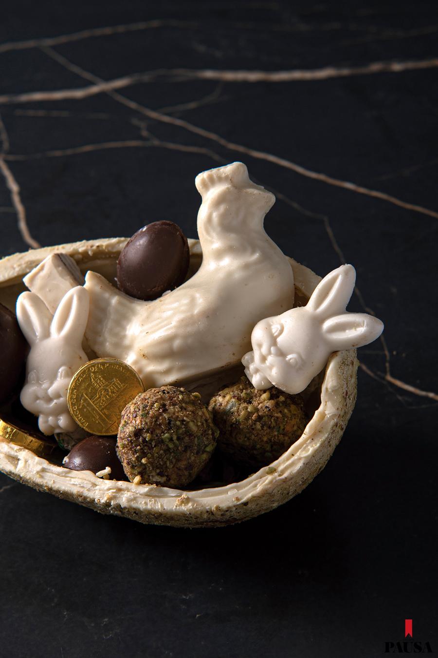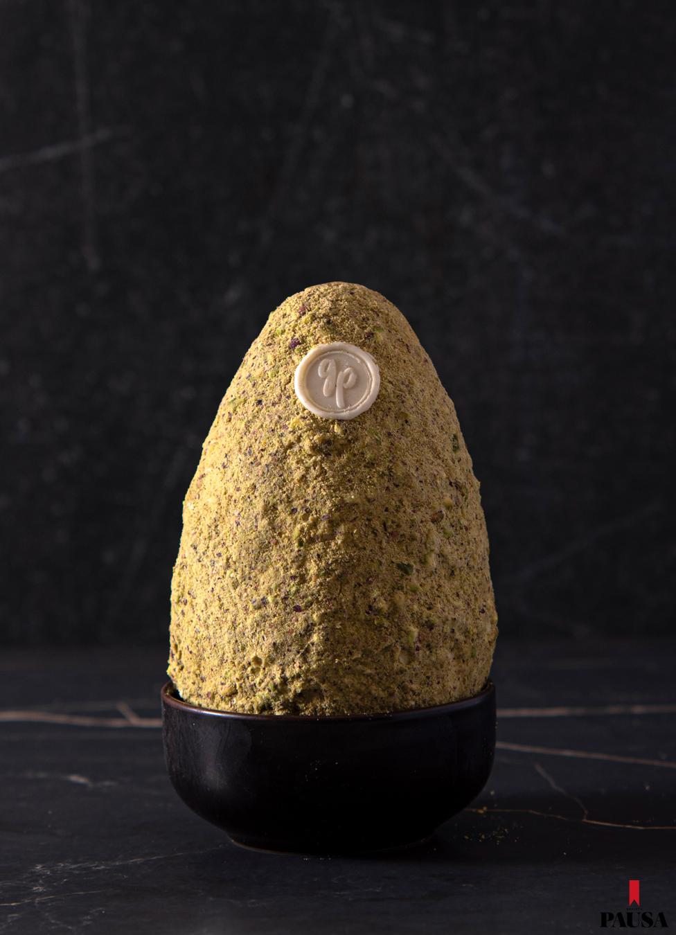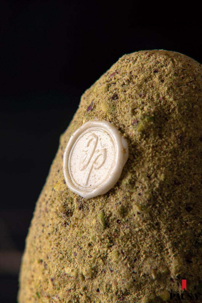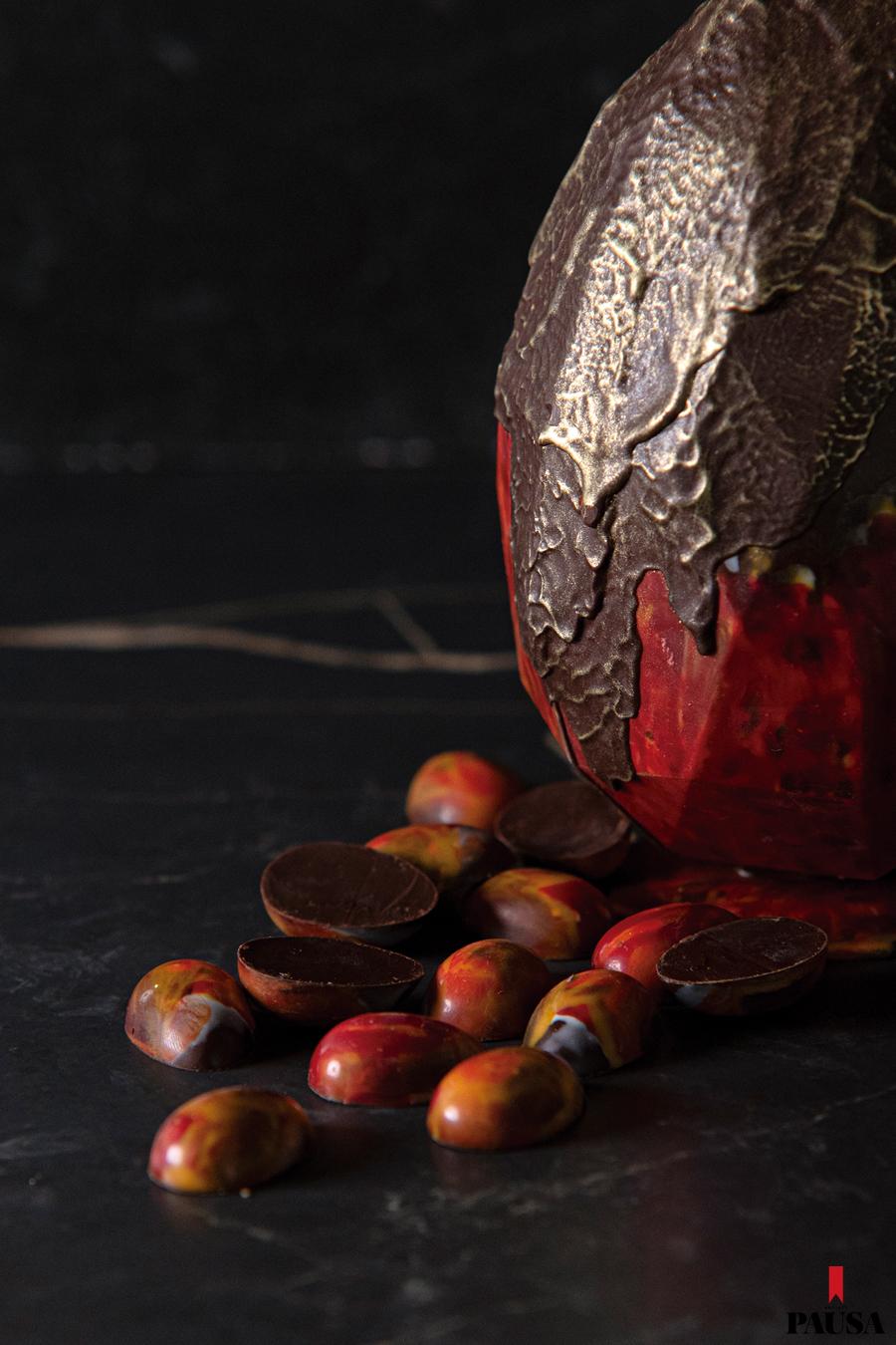 El corazón de esta propuesta es un chocolate blanco al 35 % con cacao de origen, traído de Brasil. “Tiene un sabor característico muy untuoso y delicioso”, describe Jorge Cardozo Echauri. Pistache, como fue bautizado, tiene una capa interior de pasta casera de pistachos con una ganache de chocolate blanco. Por fuera está recubierto con trozos crujientes de este fruto seco. El corazón de este deleite es una selección de bombones y trufas rellenas con crema de pistacho, tabletas, moneditas de chocolate, conejitos y pistachos tostados.