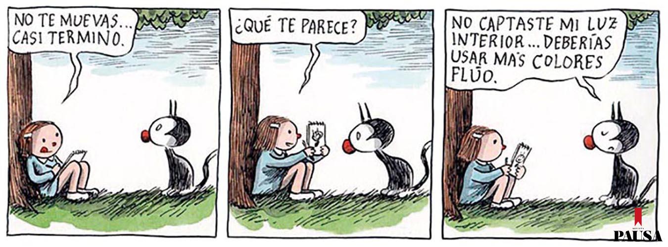 Su inspiración la toma de lo que vive día a día. Para muchas escenas se inspiró en sus hijas, para otras en su trabajo y en muchas más intenta hablar un poco de sus inquietudes. El cine, la literatura, la música, todo lo atraviesa y se convierte en arte.
