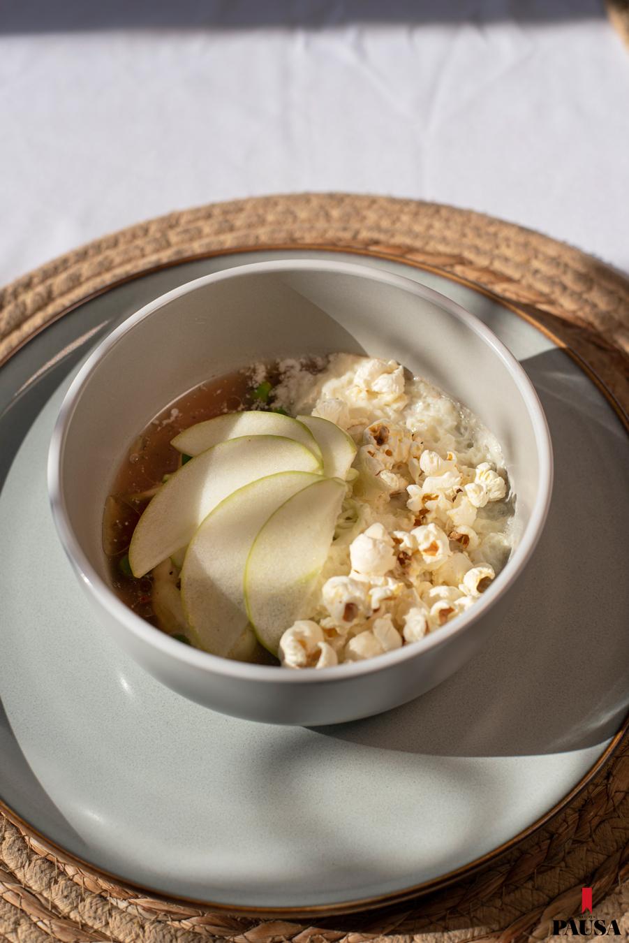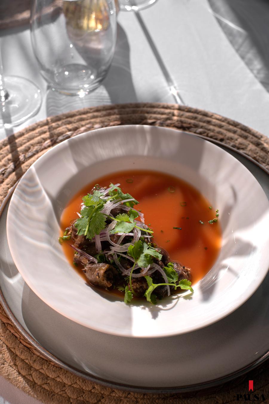 El menú nocturno sorprende con mollejas acompañadas de espuma de mandioca y yemas confitadas; y con las croquetas de cecina, romesco y mayonesa ahumada. Degustamos la stracciatella en una combinación que nos encantó: queso fresco de leche de búfala, agua de tomate, tomate asado, pepino, arveja, zucchini y manzana verde, con toques de aceite de oliva verde y pororó crocante. Es uno de esos platos que entran por los ojos, enamoran en la boca y deleitan todos los sentidos (gracias a la crocancia del maíz inflado).