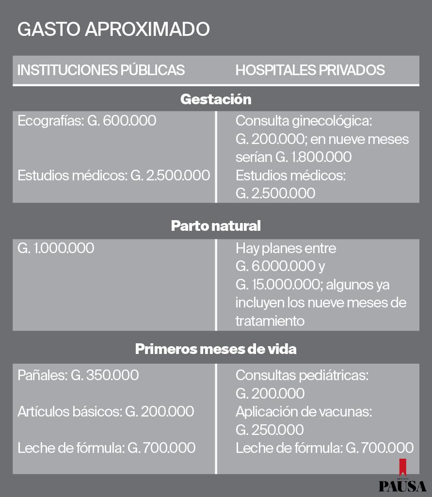 En el día del parto hay que estar bien preparados. Si bien el Estado no cobra acceso al quirófano, la paciente debe comprar guantes, hilos, analgésicos y pañales. En el caso más optimista se desembolsa alrededor de G. 1.000.000, sin contar con gasto el de acompañantes. Si, en cambio, la paciente opta por hospitales privados, los precios oscilan entre 6 y 15 millones de guaraníes, pues eso implica una internación de uno a tres días. Y, por supuesto, los costos varían de acuerdo con el tipo de parto de la mujer, si cuenta o no con un plan de maternidad, su seguro, etcétera.