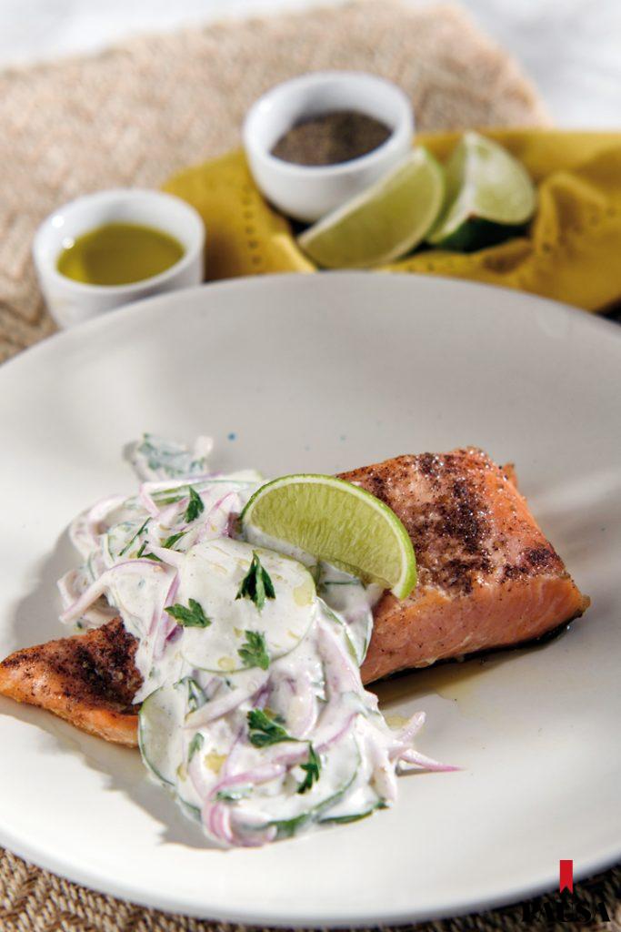 Salmón grillado con ensalada cremosa de pepino y eneldo