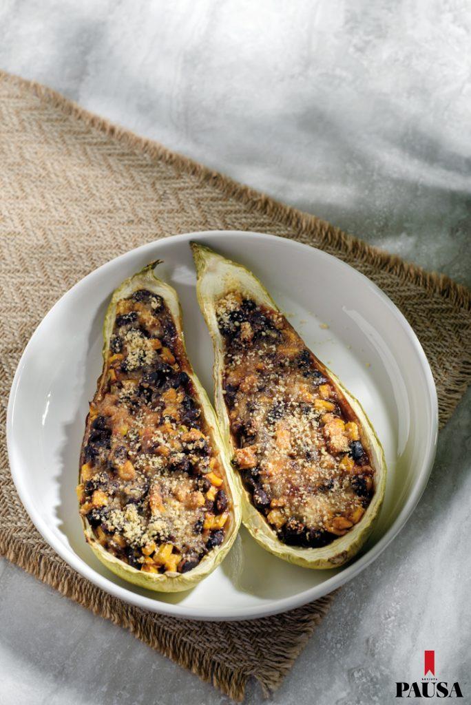 - Colocar los calabacines en una bandeja para hornear. Dividir la mezcla de porotos negros de manera uniforme para rellenar cada uno.