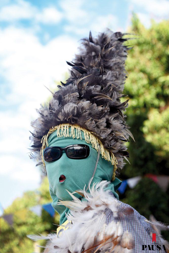 Gritos y aullidos de humanoides alucinantes completamente cubiertos de plumas ocres y grises; saltos y bailes al ritmo de tambores, trompeta, acordeón y organillo; y de fondo, el estruendo de las bombas lanzadas al cielo, propias de las fiestas patronales. Muchas máscaras primitivas e indefinibles que producen espanto y otras reconocibles que remiten a personajes más recientes y populares.
