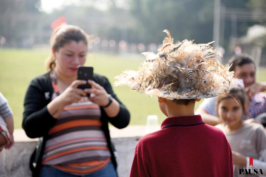 Entre los que bailaron al ritmo de la bandita guaicurú están también Nelson y Mateo Agüero, de 38 y 7 años, respectivamente. Padre e hijo atendieron la festividad completamente emplumados, desde los calzados hasta la cabeza.