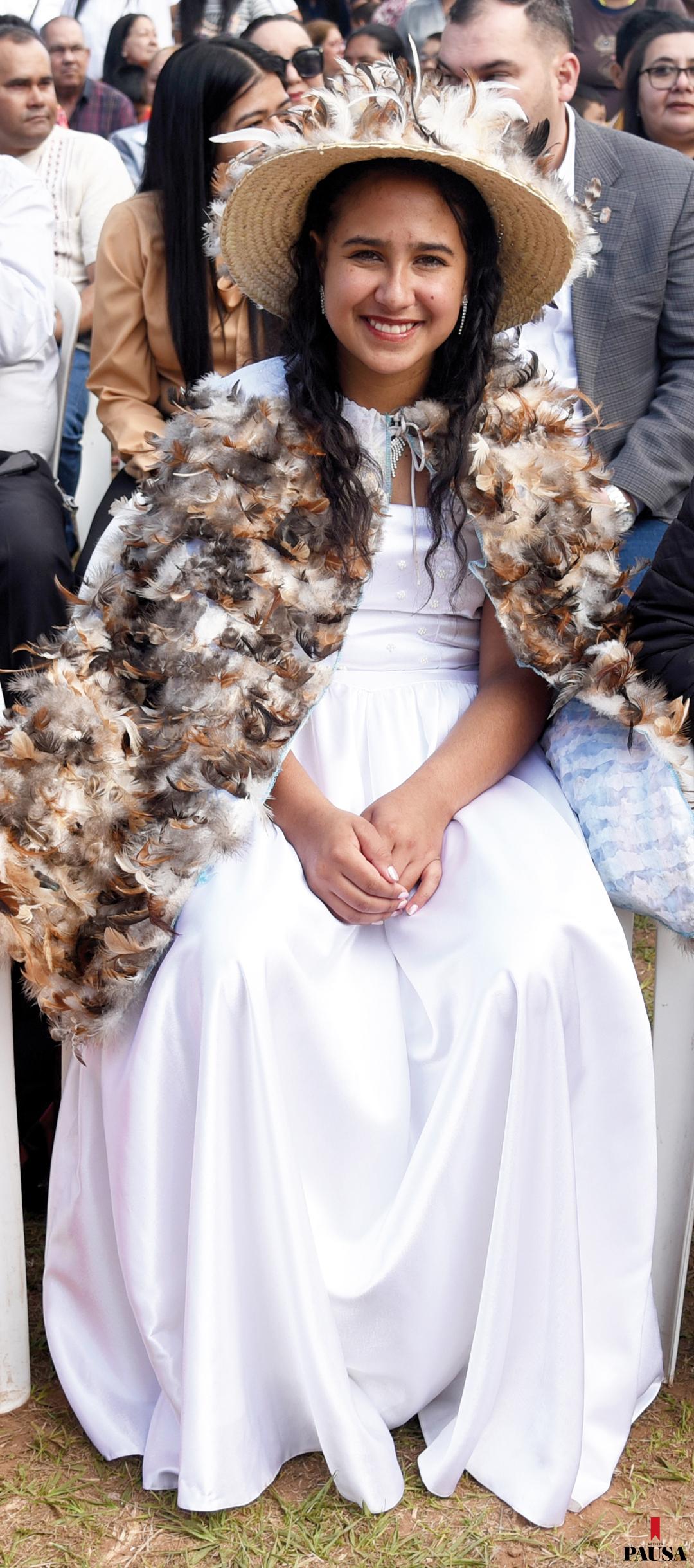 Francisca Maciel acaba de cumplir 15 años. Sus padres la han traído a la procesión como agradecimiento por su vida, ya que de pequeña pasó prolongados periodos de enfermedad. Ella vistió una capa emplumada sobre el característico vestido blanco de quinceaños.