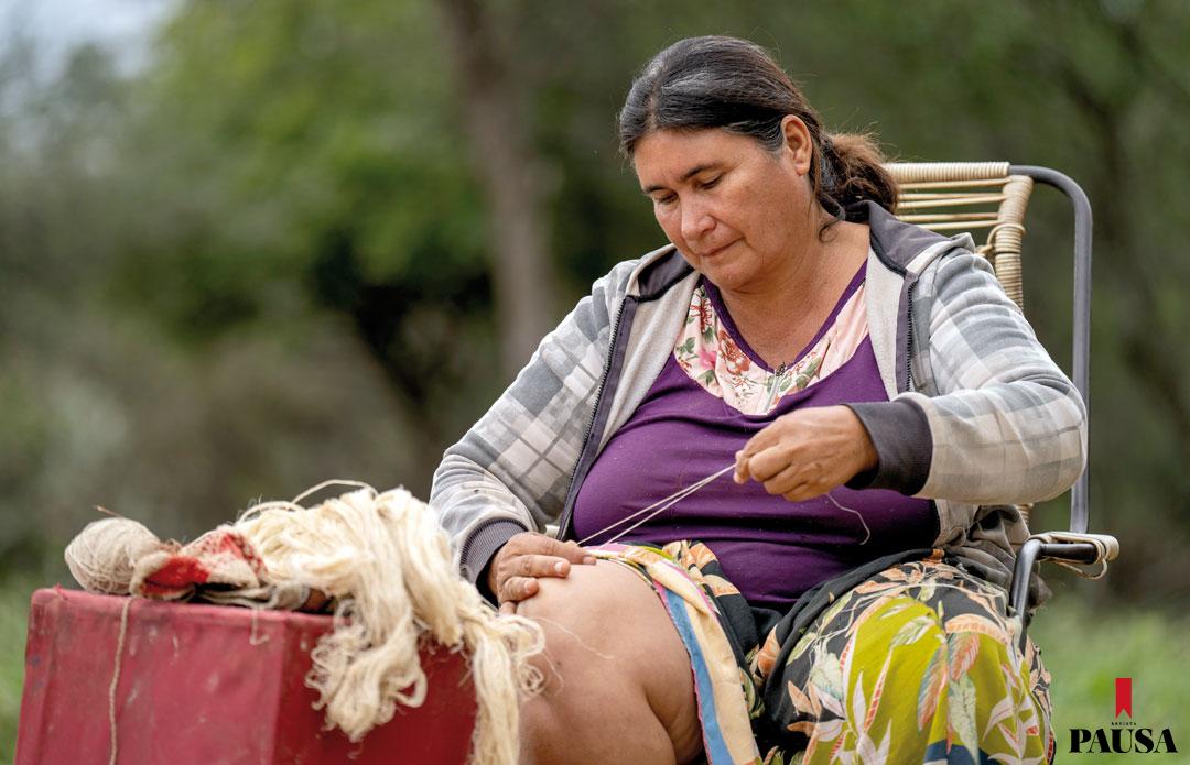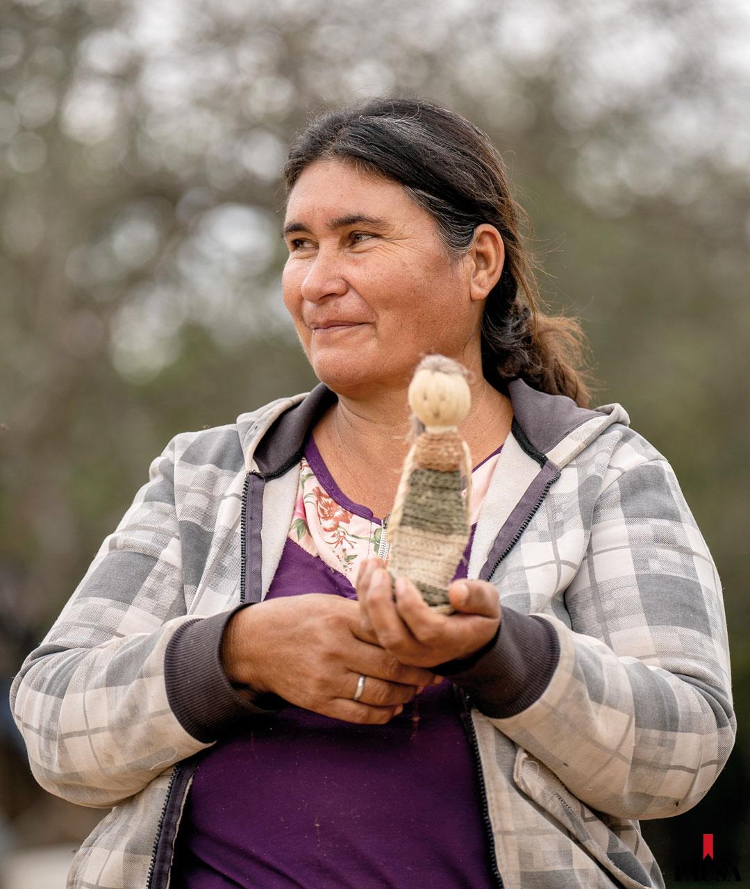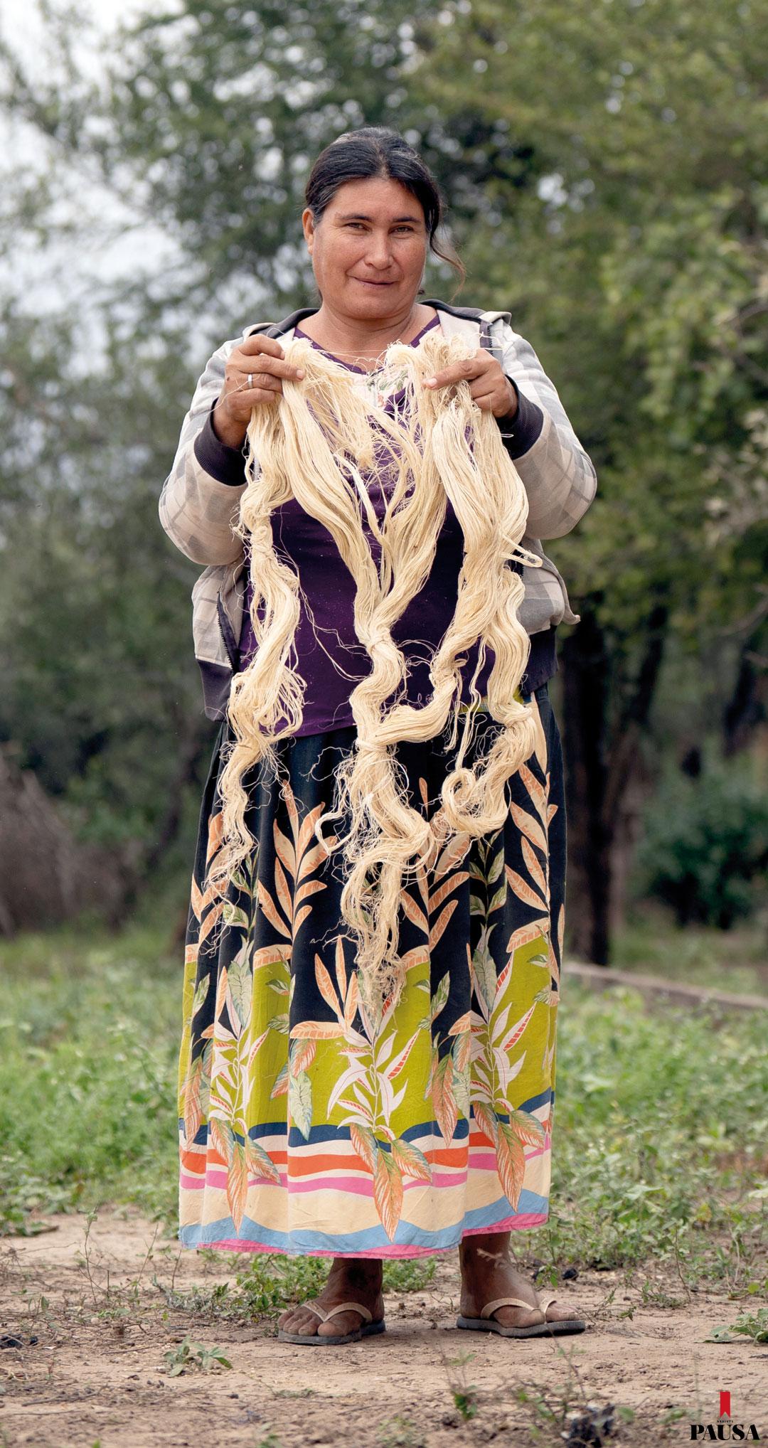 Los tejidos nivaclé son elaborados a partir de la fibra de caraguatá, una planta autóctona del Chaco. Todo el proceso de creación de esta obra —desde la recolección de la planta hasta la extracción de sus fibras, el teñido con pigmentos naturales y el trenzado final— ha sido tradicionalmente una labor exclusiva de las mujeres. Aunque, en algunos casos, como en el de Antonia Centurión, a quien también tuvimos el placer de conocer en Mistolar, es su compañero quien busca las fibras vegetales.