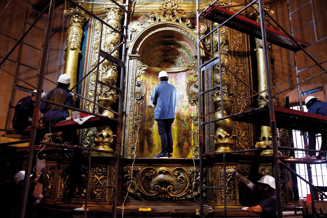 El periplo nace, aparentemente, de las manos del artista José de Sousa Cavadas, un portugués que realizó obras religiosas y decorativas en diversos lugares de la América colonial. Las piezas de las que hablamos son dos retablos de unos imponentes ocho metros de altura, con una profusión de detalles decorativos bidimensionales increíbles que coinciden con la factura del portugués. Además, hay tallas con volúmenes abruptos con volutas, flores y módulos fitomorfos y geométricos que se repiten infinitamente. Color y brillo de una pomposidad inmensa que impresiona y roba magníficamente la mirada.