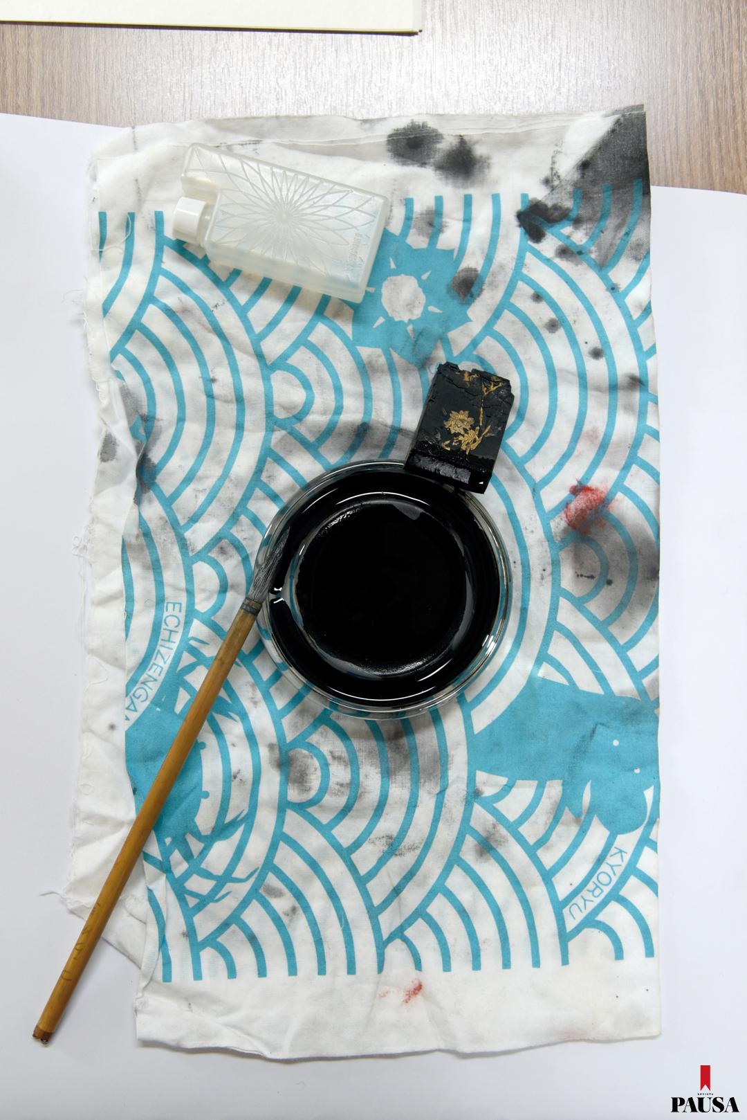 Hay una variedad de herramientas en la caligrafía japonesa, pero a las más importantes se les llama “los cuatro tesoros del estudio”: el pincel o fude, que es de bambú con cerdas provenientes de pelo animal; la tinta o sumi, que viene en formato de barra y está hecha de hollín de pino y pegamento también de origen animal; una piedra de entintar o suzuri, que se utiliza con agua para moler la barra de tinta, similar a cuando se pinta con acuarela; y el papel para caligrafía o washi, hecho de fibras de morera, más resistente que el normal, de pulpa de madera.