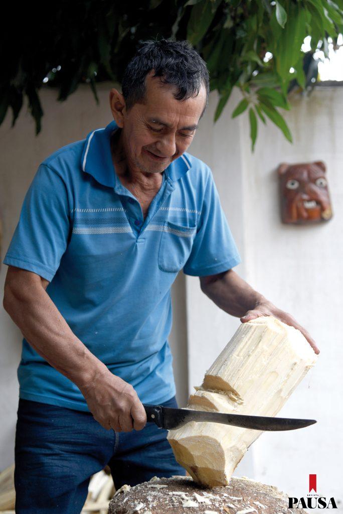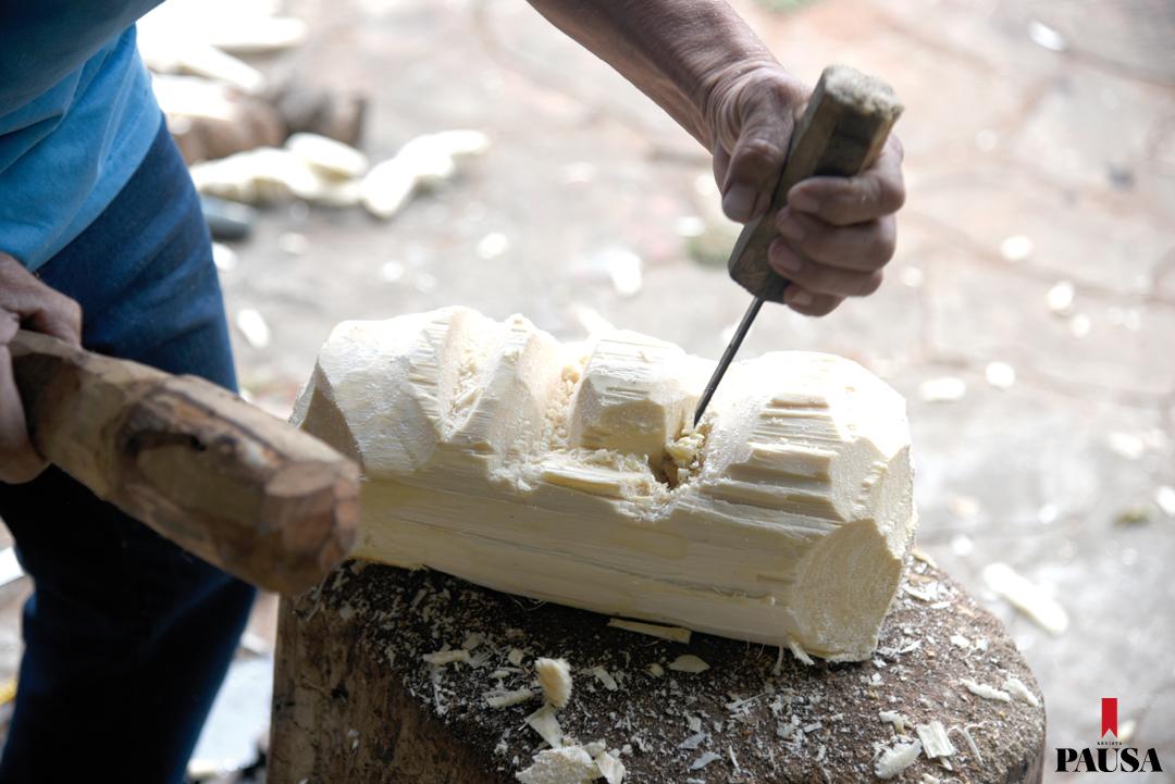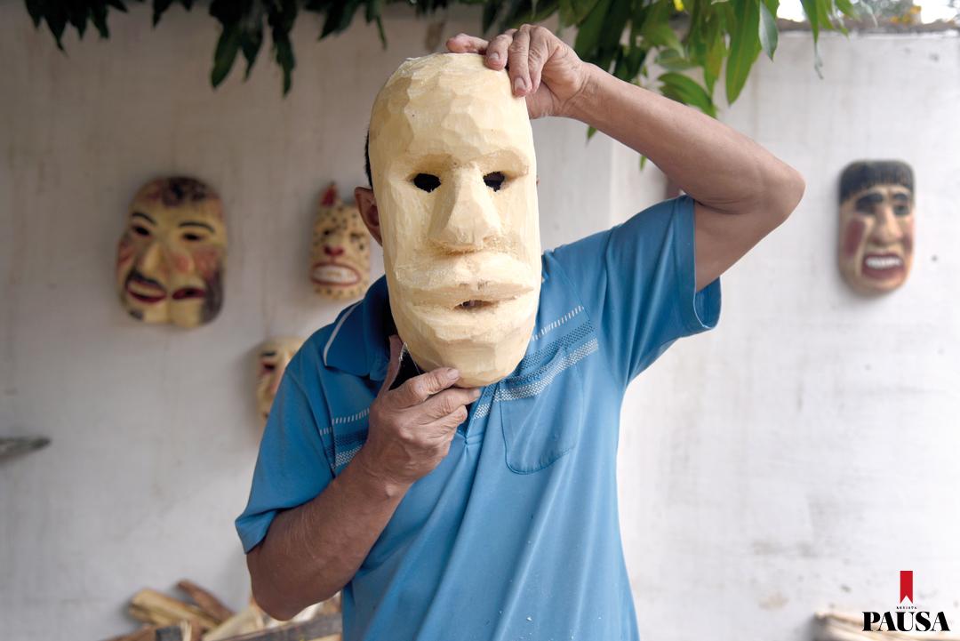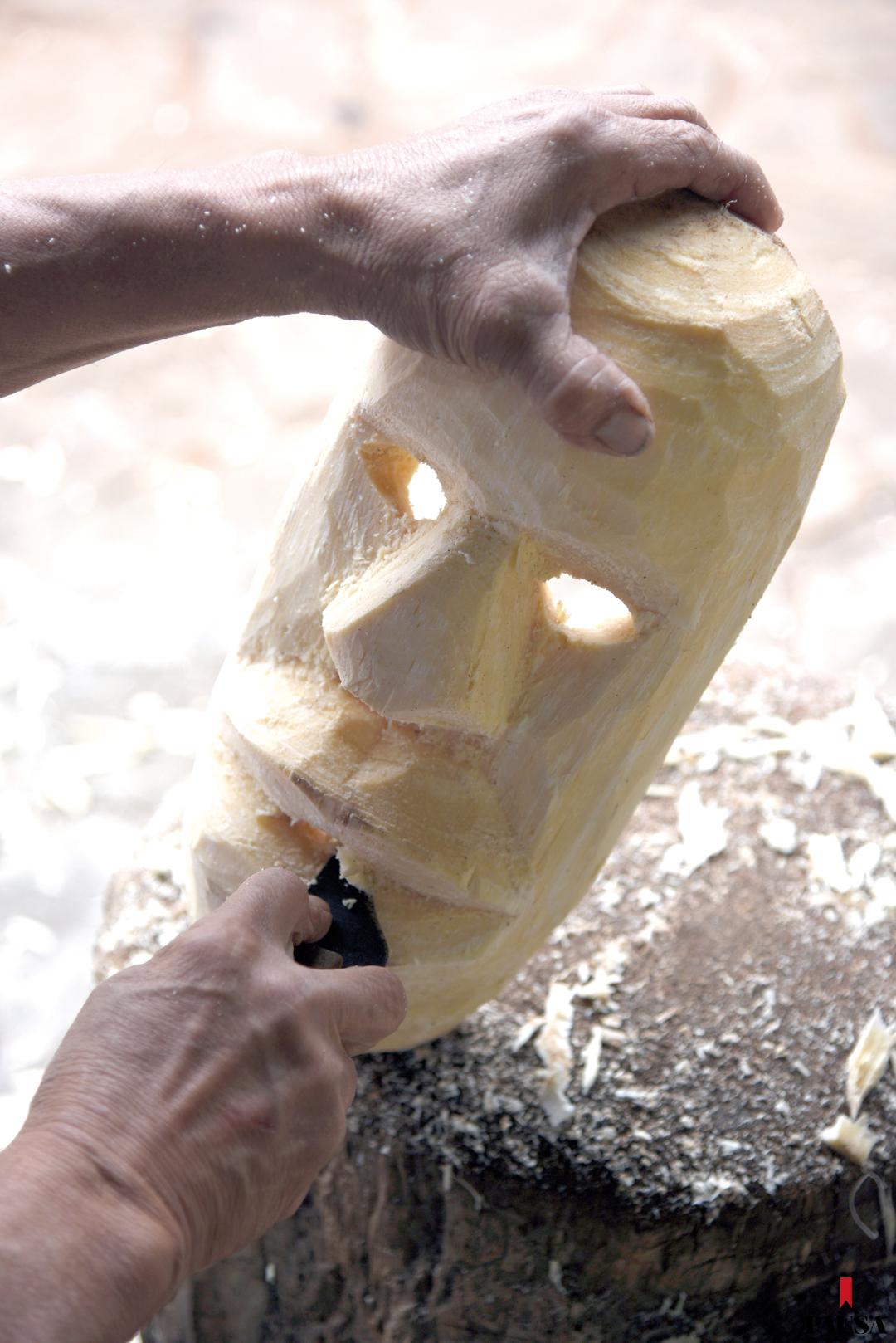El proceso inicia con la selección del tramo de raíz adecuado para lo que se pretende fabricar, lo que José hace con la pericia y velocidad que solo el tiempo enseña. Una vez elegida la pieza, comienzan los cortes perpendiculares que acotan las medidas generales de la máscara y después se procede al retiro de la corteza. Con golpes de machete comienzan a definirse las facciones generales del rostro y, por último, con herramientas más pequeñas, los últimos desbastes que terminarán la forma. En medio de ese proceso, el artesano se va probando sobre el rostro la máscara, para confirmar que la forma se adapta a quien la porte.