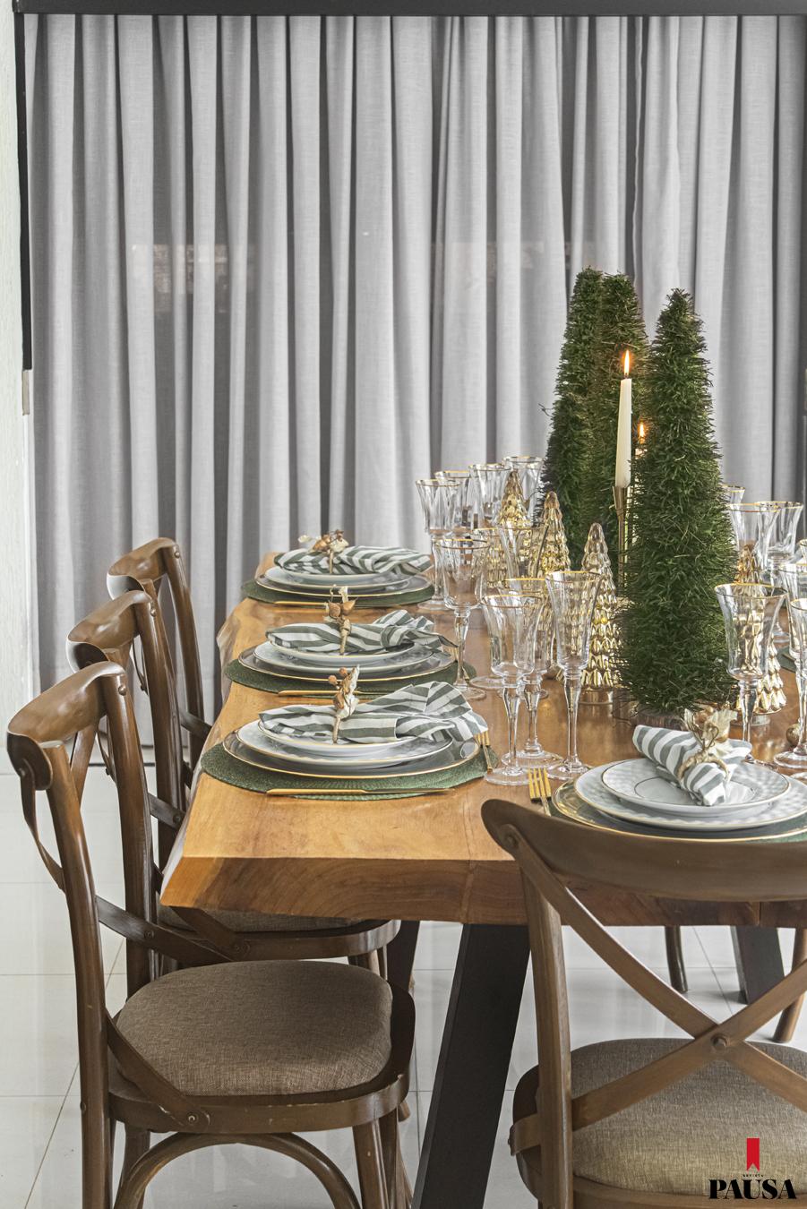 En esta puesta en escena se puede apreciar el uso de pinos y arbolitos con luces, junto con bolas bañadas en purpurina y servilleteros. “Quise usar el dorado con el verde ya que, si bien son colores navideños, no se aprecia tanto esta combinación”, explica. Con las servilletas a rayas su intención fue agregarle un aire más relajado, sin dejar de lado la elegancia; por eso, escogió copas y posaplatos con bordes color oro y unos cubiertos a tono. “La clave está en equilibrarlos con complementos más relajados”, agrega. Todos los artículos empleados son de Decodepot.