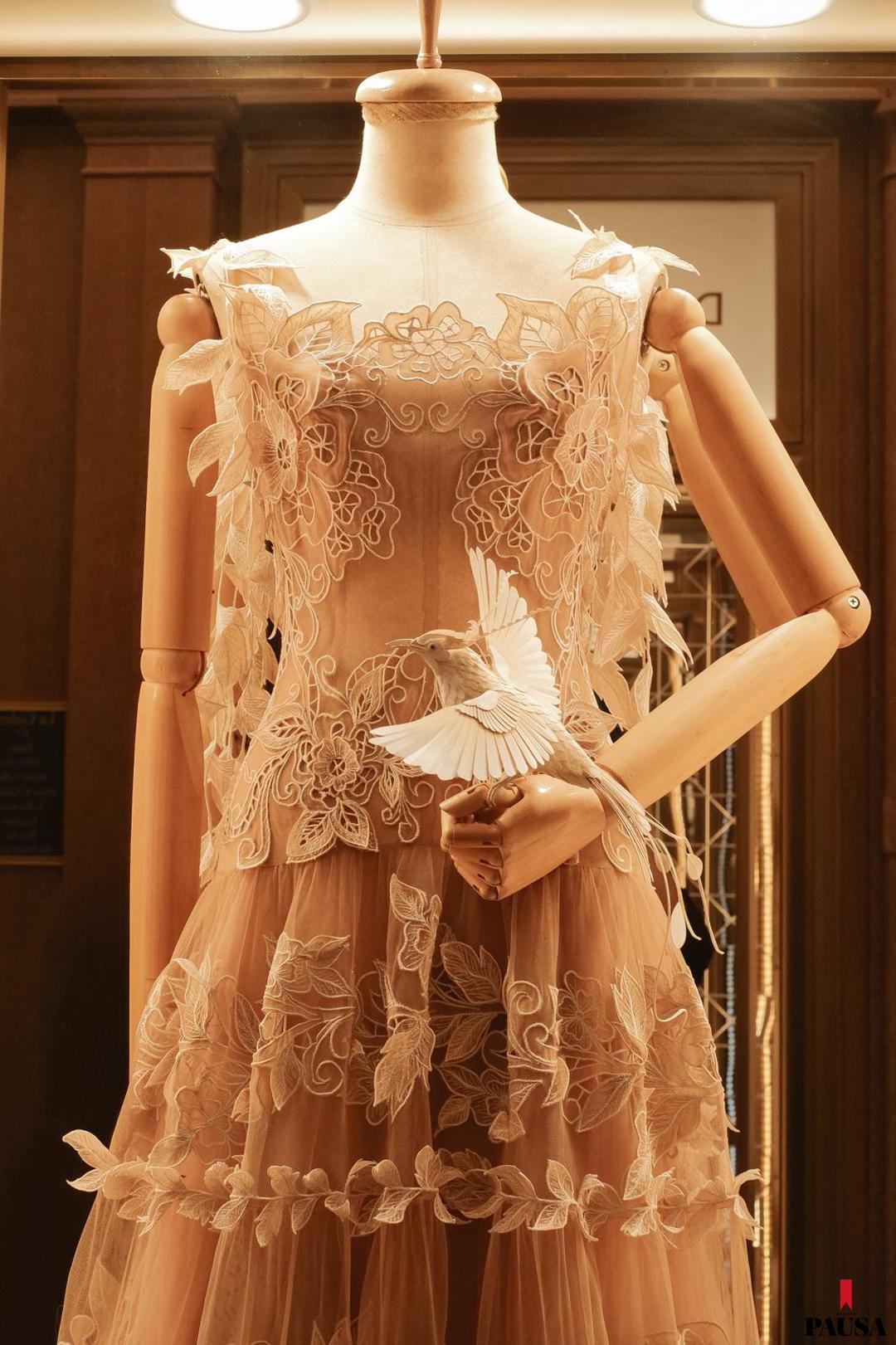 Lejos de un fastuoso y tradicional desfile, la marca optó por una apertura suave, bespoke. En lugar de una pasarela, El vuelo inesperado se elevó con vestidos en vivo para que el público pueda familiarizarse con la calidad de las prendas. “Queremos que sea una experiencia íntima y contemplativa, donde cada pieza sea apreciada de cerca, casi como una obra de arte expuesta en un museo de lujo”, agrega Javier.