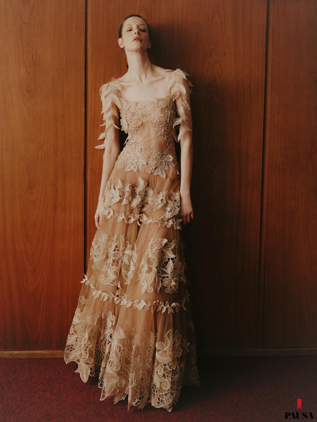 La naturaleza es una fuente inagotable de inspiración para Javier y aunque nunca se repite, cada prenda lleva impreso su sello indetectable y, a la vez, inequívoco. Se manifiesta en vestidos de noche, de cóctel y conjuntos que se sirven de seda natural y de Richelieu para traducir los códigos del universo natural al de la alta costura. Los detalles de este paisaje son reinterpretados por el diseñador con su propio lenguaje.