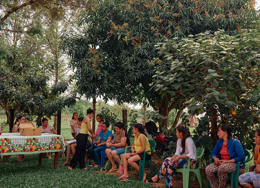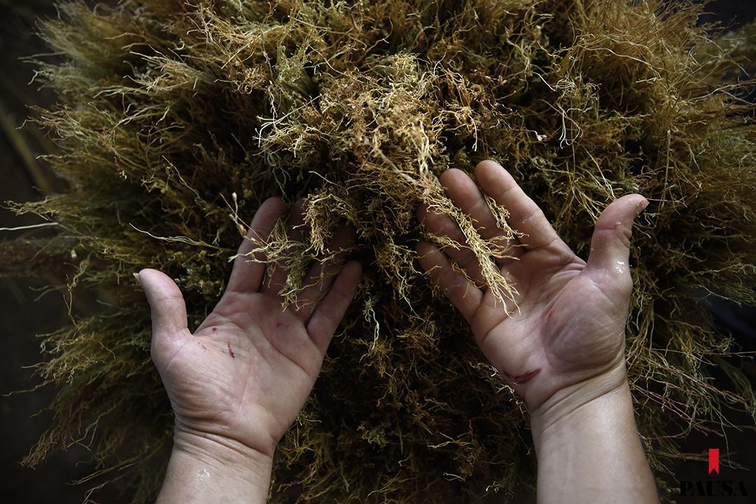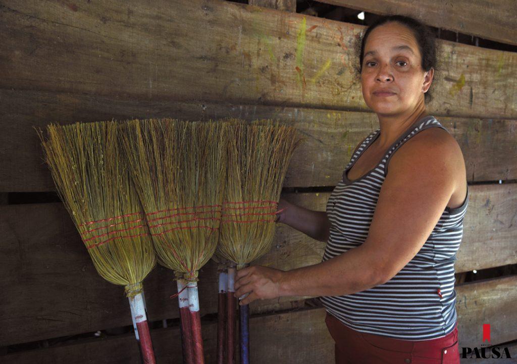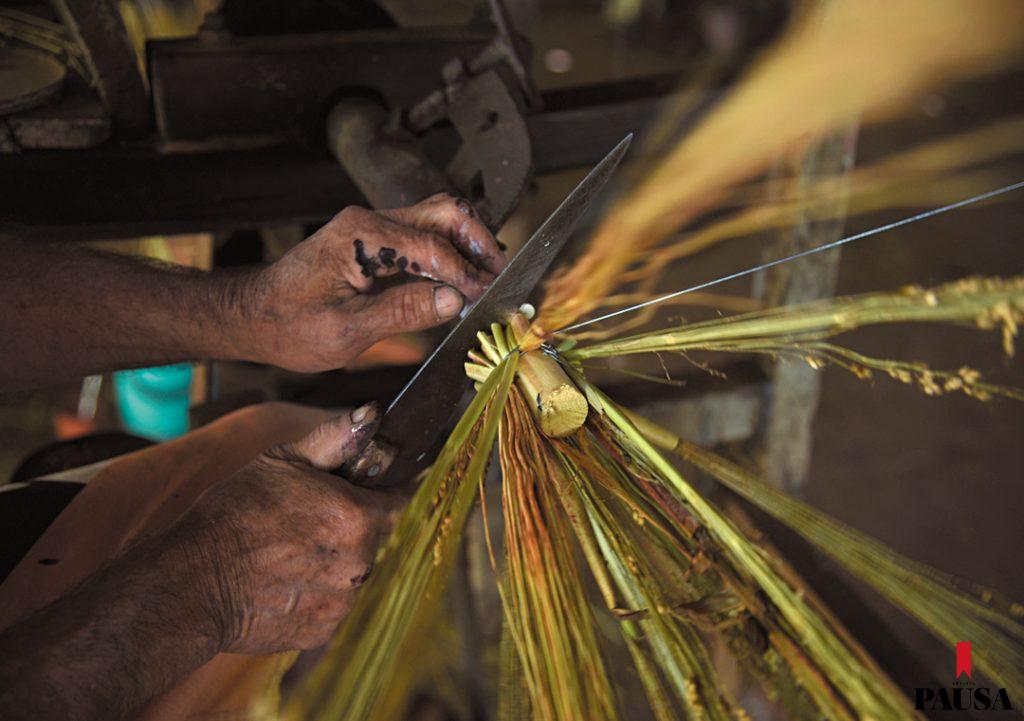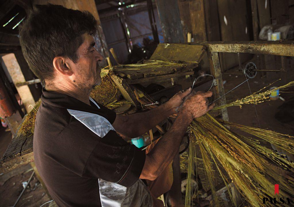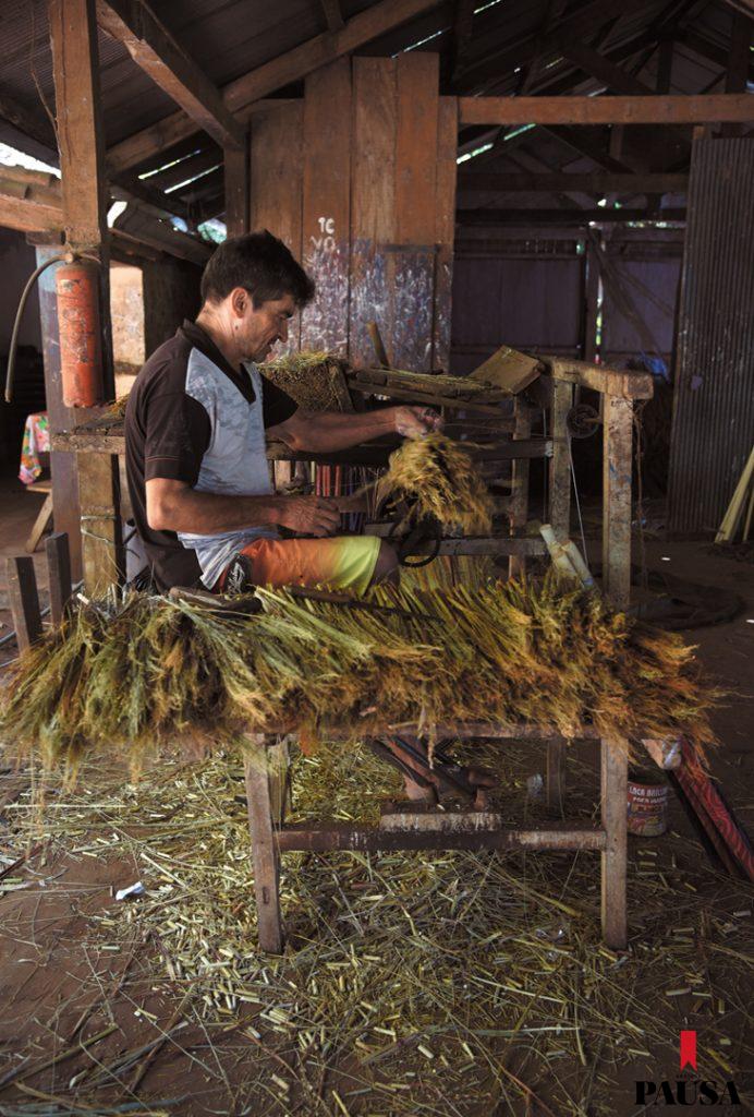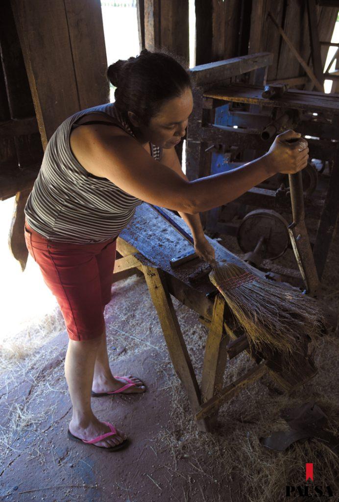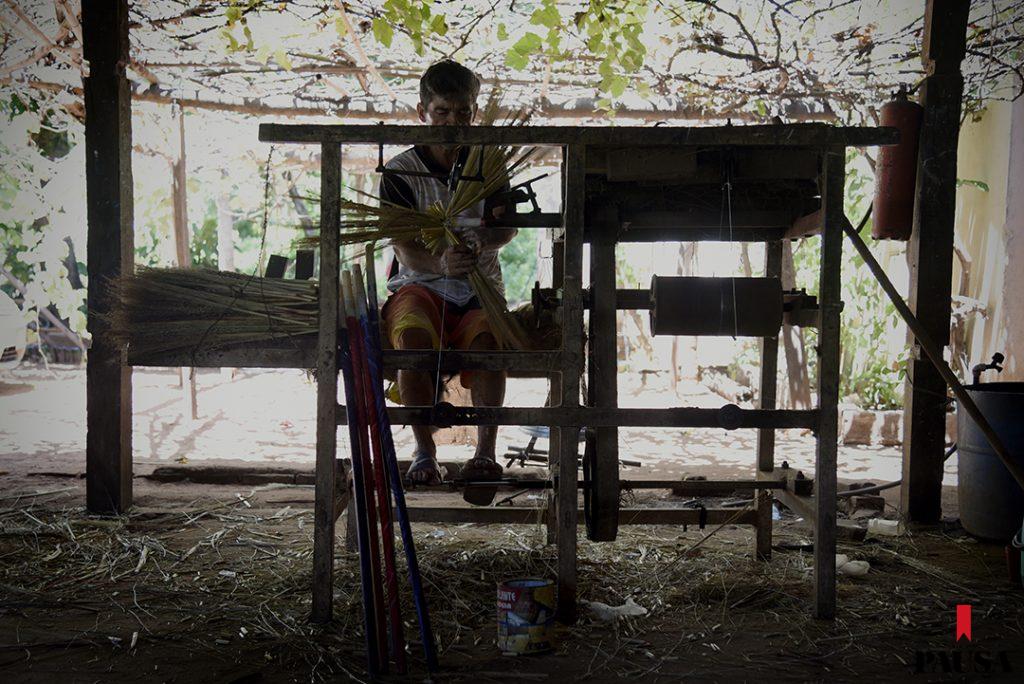 Muy temprano, Alba Agüero se levanta y prepara el desayuno para sus cuatro hijos. Junto a su papá, Luciano Agüero, y sus primos Héctor Agüero y Álvaro Ávalos, pone en marcha el pequeño taller artesanal donde fabrican escobas desde hace años, cada día desde las 7.00 de la mañana. Fueron sus abuelos quienes comenzaron con el negocio. Desde hace unos 20 años siguió su padre y hoy es ella quien continúa con el legado en las inmediaciones de Paraguarí, en el kilómetro 60,5 de la ruta 1. Bajo el destartalado techo de chapas del taller, la luz se ve cálida y el ritmo de trabajo, vertiginoso, mientras pequeños fardos de paja escobera van y vienen de un punto a otro. El olor del solvente que se usa para la pintura de los mangos de madera es fuerte, tanto como las fibras del sorgo que con movimientos repetitivos harán desaparecer el polvo del piso de miles de hogares paraguayos. Algunos pequeños hoyos en el techo proyectan haces de luz sobre la piel curtida de quienes trabajan allí.